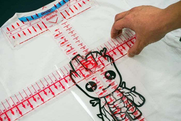Hi Rhinovers! menempatkan desain tepat di posisi tengah kaos ternyata bukanlah hal yang mudah loh bagi beberapa orang. Saat melakukan proses press pada kaos, menempatkan hasil cutting di posisi yang sesuai diperlukan insting yang cukup kuat. Biasanya hal ini dapat dengan mudah dilakukan apabila kalian sudah sering melakukan proses press berulang-ulang. Sehingga insting tersebut sudah terasah dengan sendirinya.