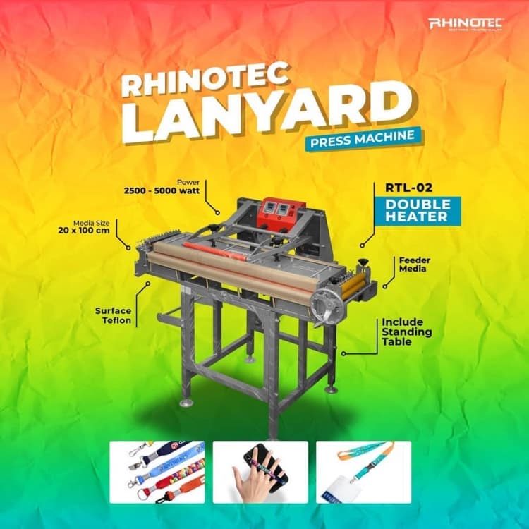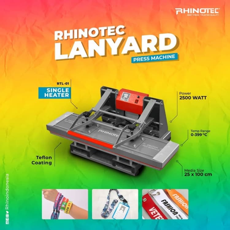 Rhino menghadirkan mesin heat press lanyard RTL 01 dan RTL 02. Kedua mesin ini khusus diperuntukan untuk membantu produksi custom lanyard maupun item dengan ukuran yang sesuai.