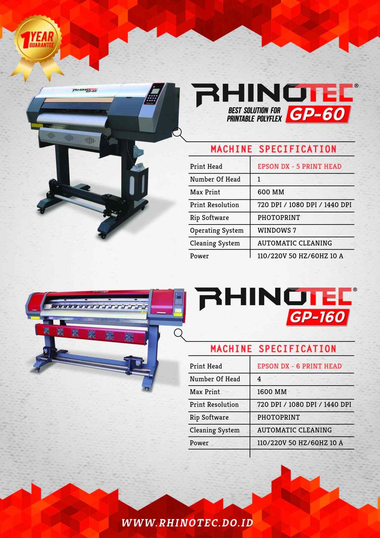 Mesih Rhinotec GP 60 merupakan mesin printing indoor dengan tinta eco solvent, yang memiliki area print sebesar 60 cm. Mesin ini dilengkapi dengan print head Epson DX – 5, serta resolusi print yang berkualitas tinggi. Terdapat auto-cleaning sistem yang akan memudahkan kalian dalam melakukan perawatan terhadap mesin GP 60 ini.