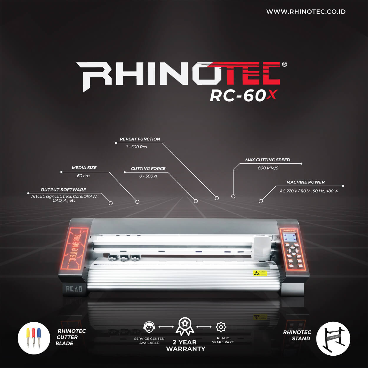 Mesin cutting sticker Rhinotec RC 60 X ini memiliki motor penggerak yang lebih besar sehingga kecepatan potong bisa meningkat tanpa menimbulkan bunyi berisik. Dengan kecepatan potong yang meningkat nyaris dua kali, kapasitas produksi juga bisa meningkat.